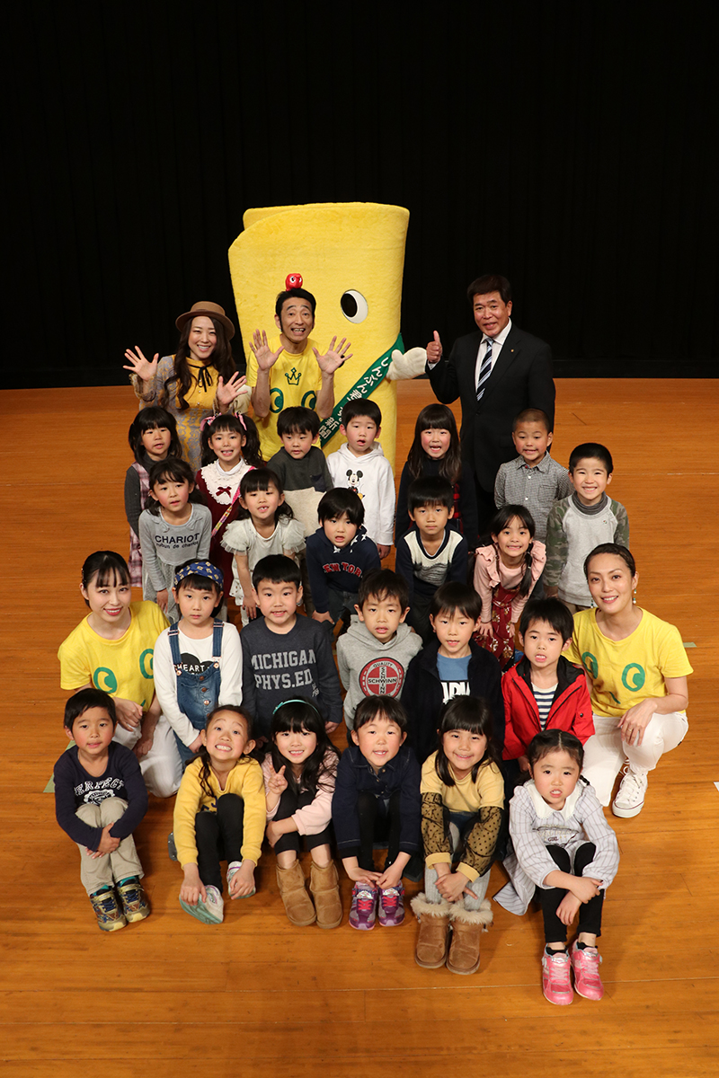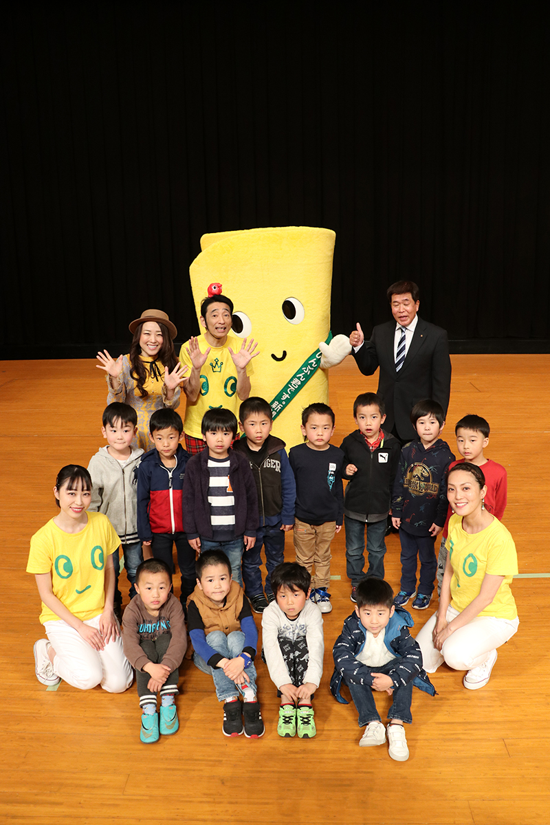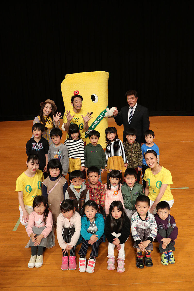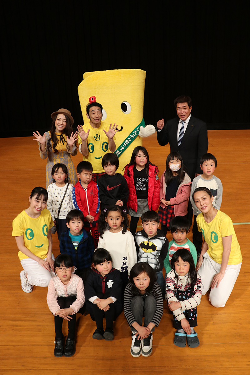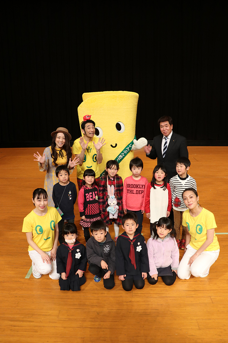 最後にはラッキィ池田さん、多治見市長、佐藤梓さんとペーパーガールズ、しんぶんくんと共に記念撮影。撮影した写真は『思い出新聞』となって、参加した子どもたちに名前入りで配布され、小学校入学前の良い思い出になるでしょう。