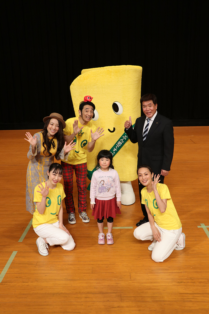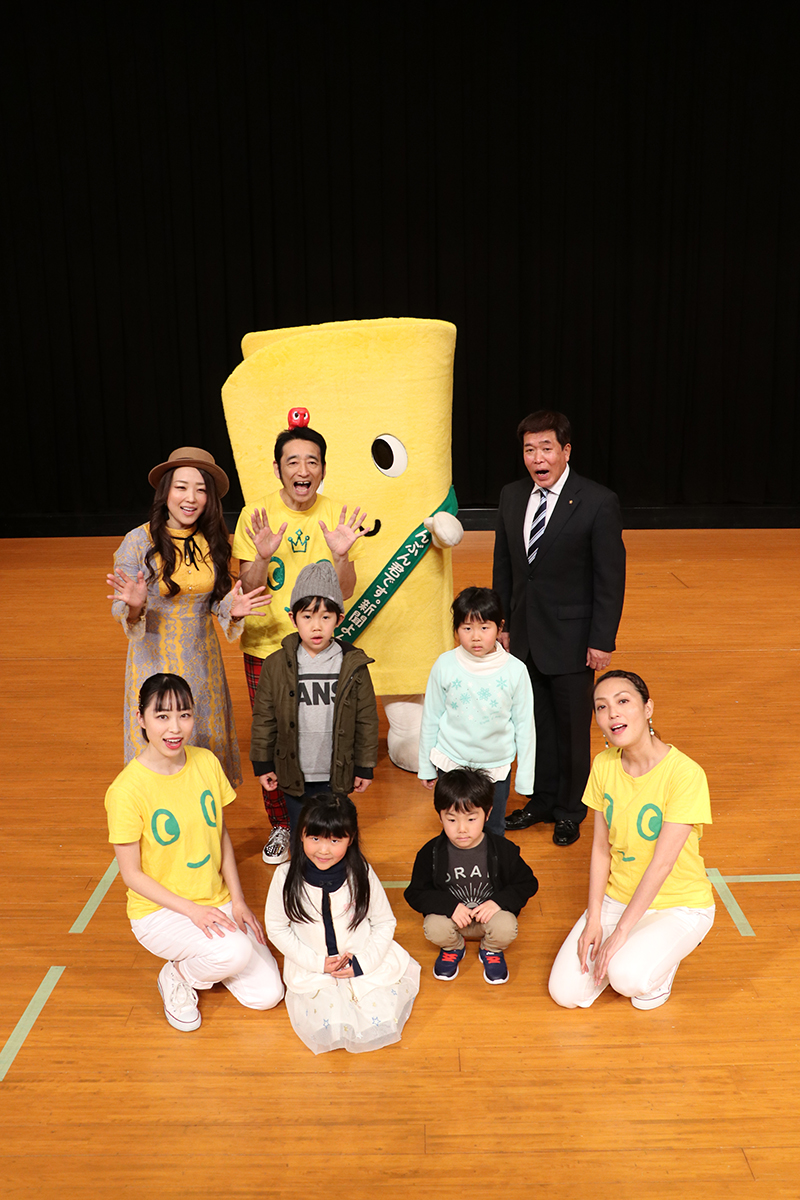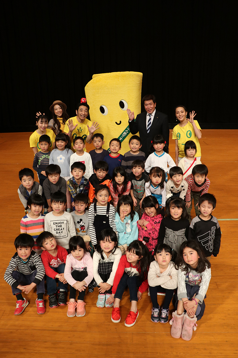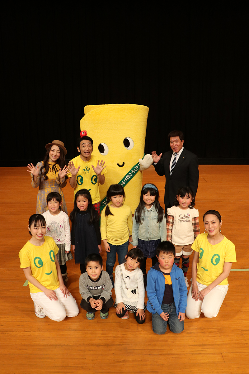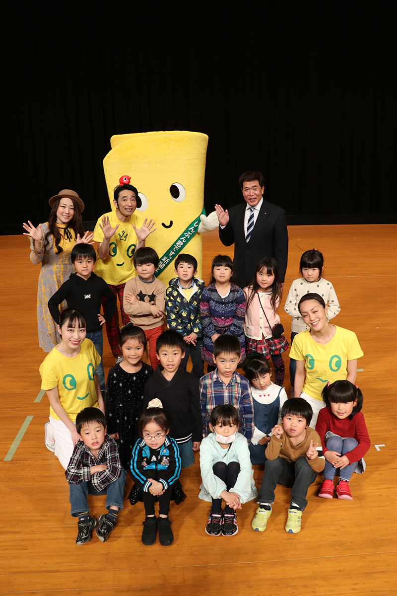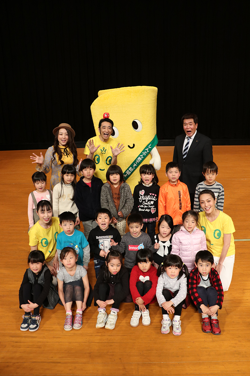 最後にはラッキィ池田さん、多治見市長、佐藤梓さんとペーパーガールズ、しんぶんくんと共に記念撮影。撮影した写真は『思い出新聞』となって、参加した子どもたちに名前入りで配布され、小学校入学前の良い思い出になるでしょう。