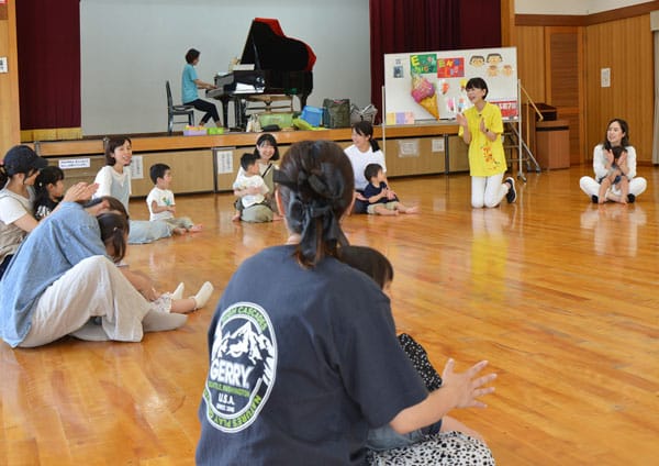 堀江さんによる生のピアノ演奏と、高須さんの歌に合わせて楽しそうに動く子どもたち。遊びやゲームの中から自然と、音やリズム、英語を楽しんでいる様子が見られました。