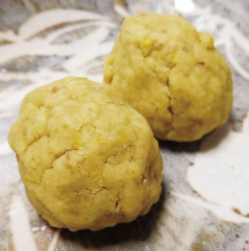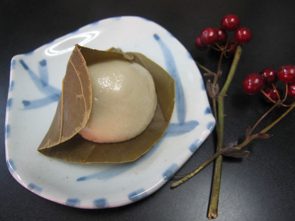 もちもちの生地に甘さ控えめのこしあんを山帰来の葉(サルトリイバラ、東濃ではがんどち、がんどうちとも呼ばれる)で包みます