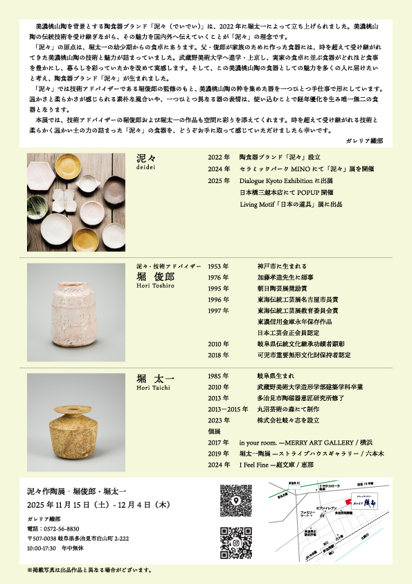 美濃桃山陶を背景とする陶食器ブランド「泥々(でいでい)」は、2022年に堀太一によって立ち上げられました。美濃桃山陶の伝統技術を受け継ぎながら、その魅力を国内外へ伝えていくことが「泥々」の理念です。