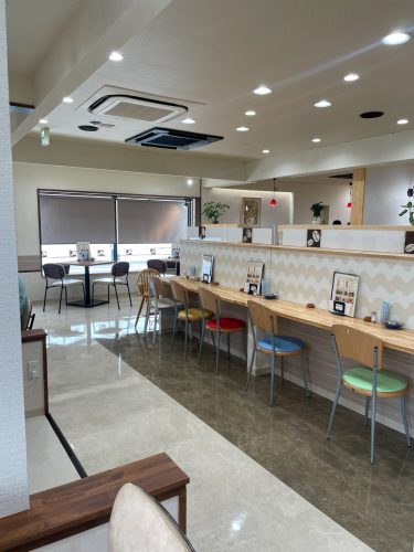 白とベージュを基調とした明るい店内。座席数は全部で64席、カウンター、テーブル、小さなお子さまがいても安心の掘りごたつ式が用意されています。またWi-Fiも完備され、一日を通してくつろげるお店です。