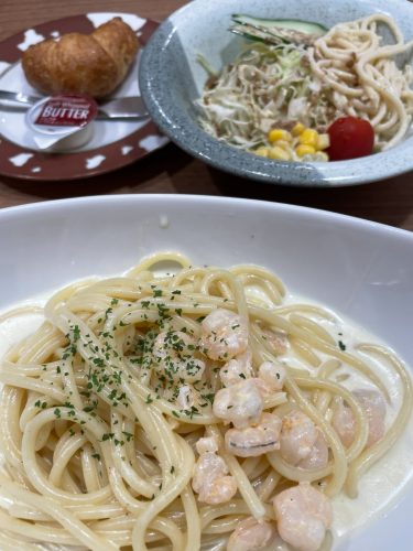 ランチには週替わりの小エビのクリームパスタセットをいただきました。さっぱりとした味で、野菜たっぷりのサラダ、ミニクロワッサンも付いていて、お腹いっぱいになりました。