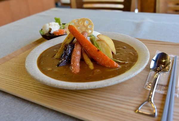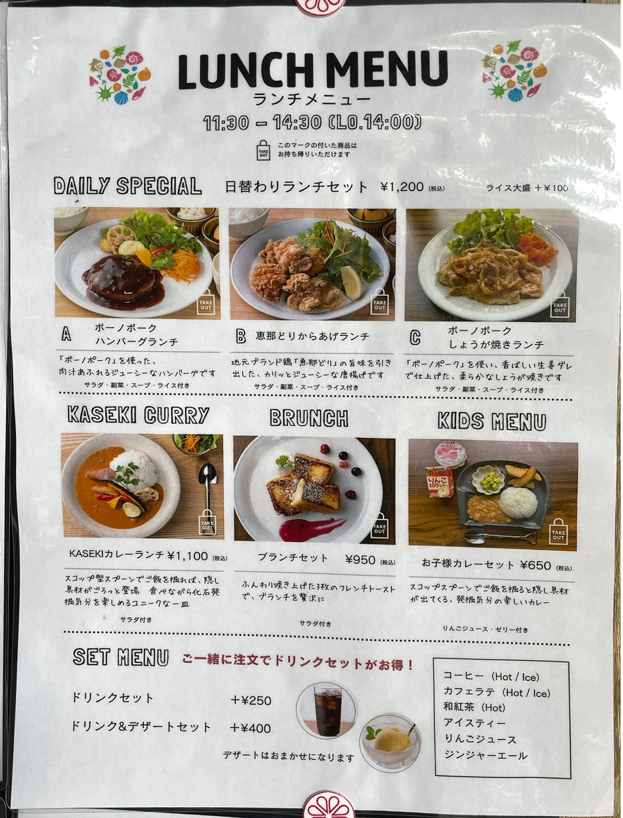 観光協会とカフェスタッフとで考案したメニューは瑞浪の魅力たっぷり。「KASEKIカレー」は、瑞浪観光の代表「化石」にちなんだメニュー。スコップ形のスプーンでご飯を掘って、隠れた具材を見つけるという、楽しい一品です(お子さまカレーもあり)。