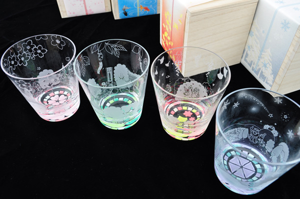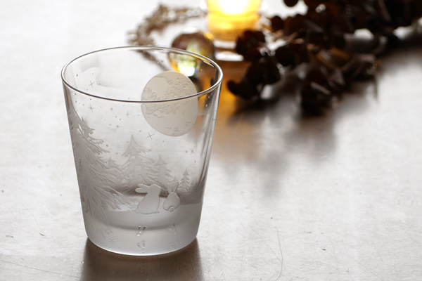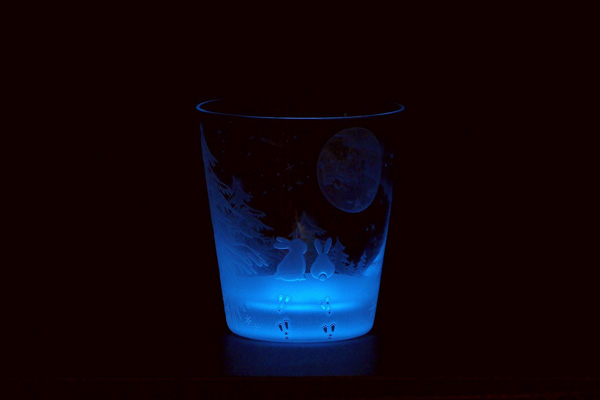 月光グラスは、サンドブラスト加工(表面を削る技法)した部分に特殊な蓄光剤を埋め込むという独自の特許技術によって作られます。