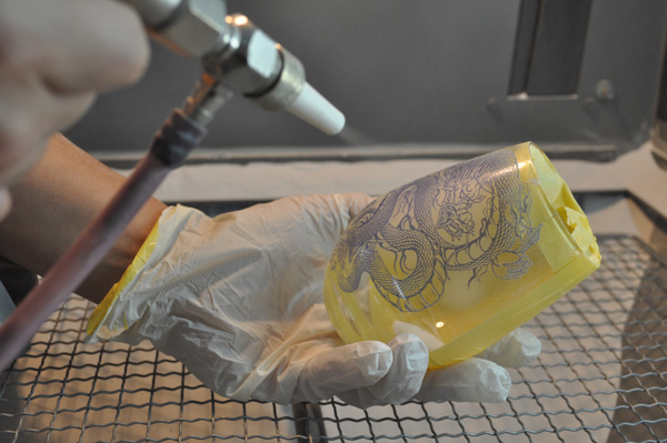 サンドブラストで模様を描く。底にあるのが畜光剤