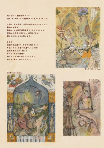 幼い頃より、動植物すべてに魂か、ぼんやりとした意識があると思っておりました。人間は、声や動作で意思や感情を出せるけれども、動物や植物は?動物は、ある程度感情を表すことができますが、植物は生態系の変化という結果でしか、訴えられないように思います。ひとは家族でも友達でも、手と手を取るようにお互いのことを想い気遣い、そして祈り言葉や動作で示し慈しみまたは、大小の感情を時にぶつけ、時に封じたりしながら日々を、重ねて歩いています。幼少期に観た映画の中で何もない、真っ白な世界に降り立つ場面があったのですがもしも、自分がその場に降り立ってしまったら・・・地面も天井も右も左も真っ白で、誰も何も無い世界。考えただけで、本当にゾッとしたことを、今でも思い出します。1人でいても、周りには木があり花があり鳥が飛んでいたり、虫が這って誰かの家があり、誰かの気配があることの尊さ。なにかしら、他者を感じて、私たちは生きている。「手を取り合える距離にいる人」が、いるということに感謝してそして、各々が、その一瞬や長い先のことを見て思考を巡らせている不思議・・生きる為の、そんな動作は動植物たちもきっと、人間が思う以上に同じ感情があるかも知れないと絵の中に、他者と関わる彼らも登場させております。絵を眺めていただきながら誰か大切な方のことを思い浮かべる瞬間などあれば幸いです。