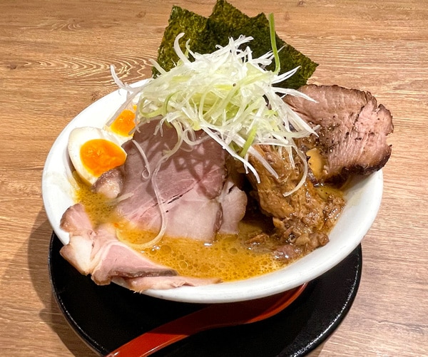 「優しくコク深いみそスープの上に、低温調理のチャーシュー、トロトロに煮込まれたチャーシュー、厚切りチャーシューと、食感の違う3種のチャーシューが乗り、そこに味玉、海苔などが添えられた豪華な一品。」