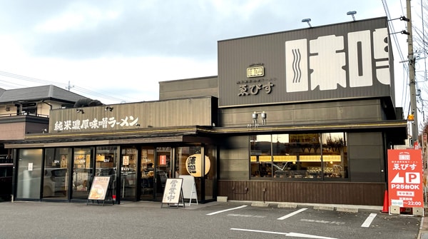 「味噌」と大きく書かれた黒い壁面が印象的な店舗。