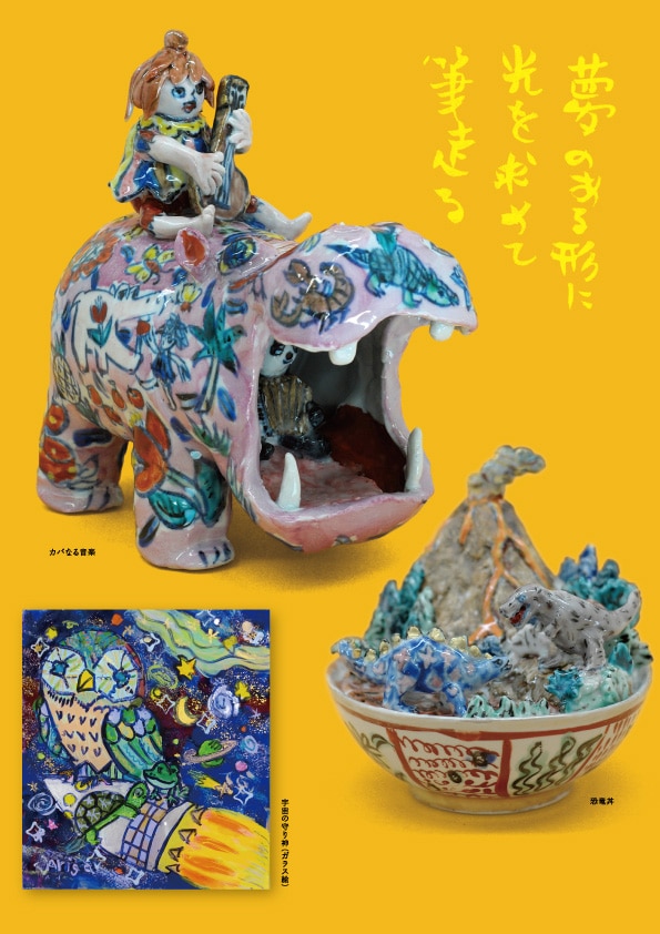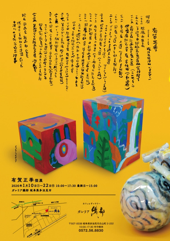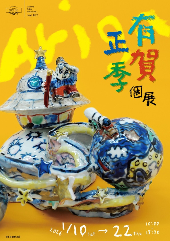 色とかたちがのびのびと広がり、思わず心がほぐれる有賀正季さんの世界。ガレリア織部で4回目となる今回は、さらに豊かな表情の作品がそろいます。思わず微笑むような作品をお楽しみください。
