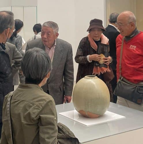 初日に行われた開会式には安藤さんの人気ぶりが伺える大勢の出席者が集まり、仙太郎窯の3代目を継ぎ、20代で桃山陶の第一人者だった加藤唐九郎の勧めで志野・黄瀬戸を制作し始め「わしのやきもの人生が始まった」と振り返りました。