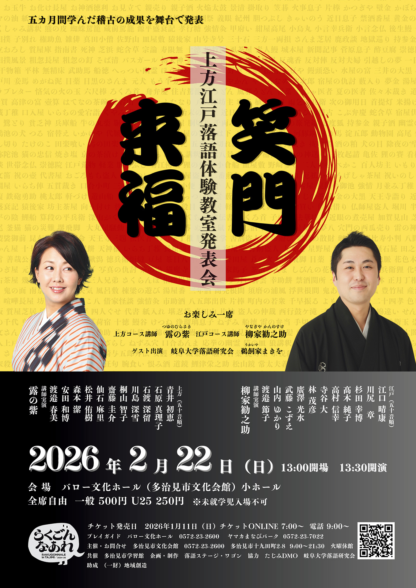当日は、両講師(上方・露の紫さん、江戸・柳家勧之助さん)、岐阜大学落語研究会の一席もあります。