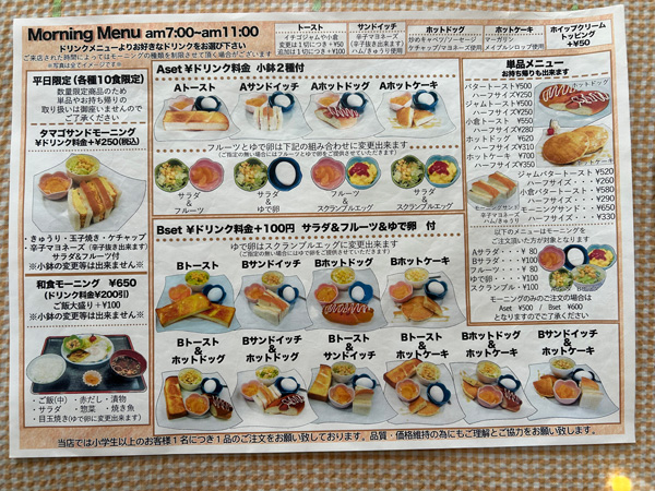 選べるモーニングは11時まで。ドリンクだけの料金でトーストやサンドイッチが選べます。