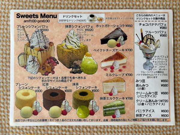 パフェや手作りシフォンケーキなどスィーツメニューも豊富に揃っています。