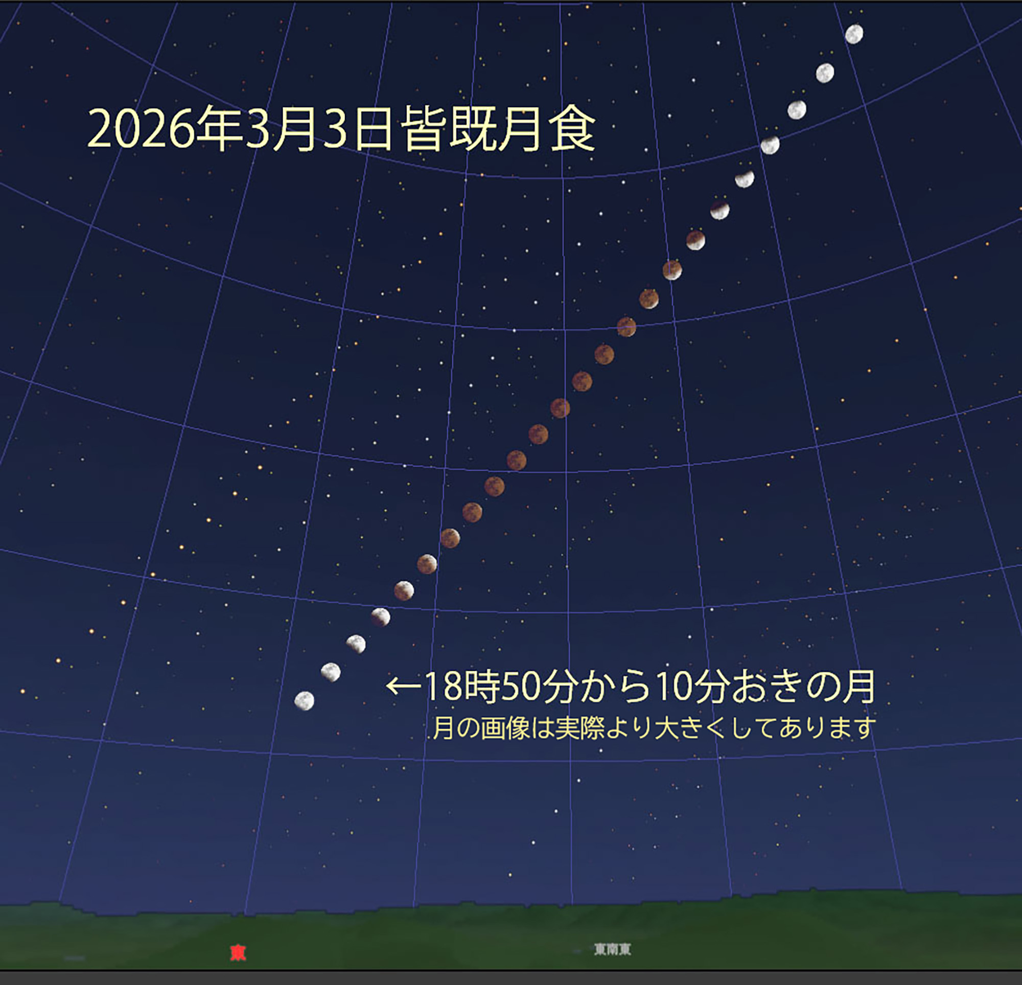 真東の空、低いところで18時50分からかけ始め、20時5分から皆既月食になって、赤黒い月になります。20時34分が皆既月食の中心で夜空も暗くなるので皆既中は星空が見えています。