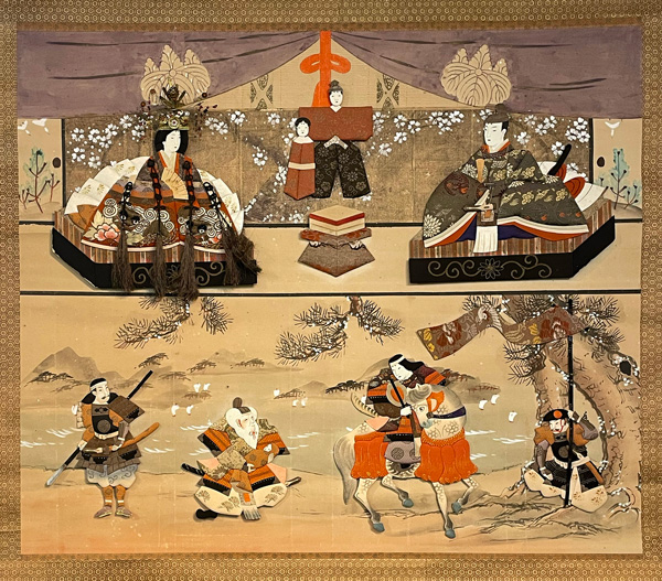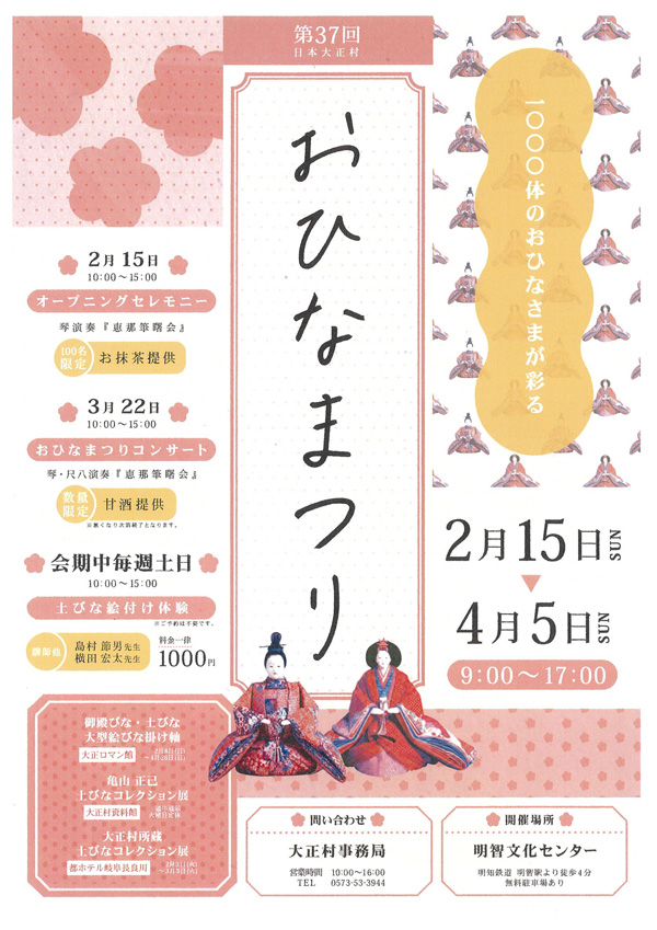 明智文化センターロビーでは大正村所蔵の1,000体のおひなさまの大型段飾り、大正ロマン館では「御殿びなと土人形展」と「大型押絵びな掛軸展」、大正村資料館では「土びな展」を展示中。