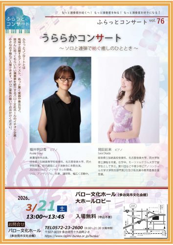 【多治見 バロー文化ホール】ふらっとコンサートvol.76 うららかコンサート~ソロと連弾で紡ぐ癒しのひととき~