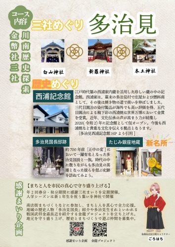 金幣社三社をめぐる、川南歴史探索です。西浦記念館や、多治見国長邸跡、たじみ銀座地蔵にも訪れます。