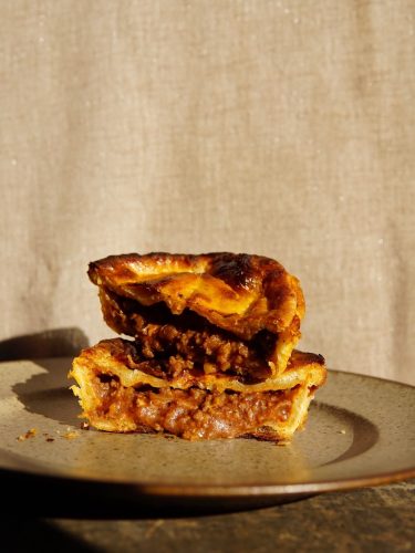 看板メニューは、生地から具材まで全て手作りにこだわった「ミートパイ」。本場オーストラリアでそのおいしさに魅了された田口さんが、日本人の味覚に合うよう工夫を重ねた一品です。香ばしく焼き上げたパイ生地の中には、オーストラリア産100%の牛肉がたっぷり。ひと口頬張れば、肉のうまみがじんわりと広がります。