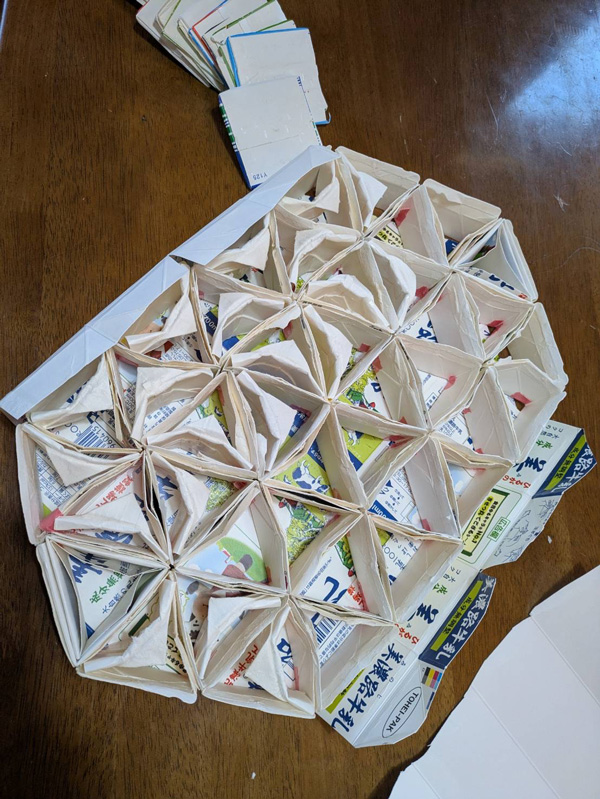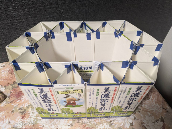 試作を何度も繰り返し、70個分の牛乳パックを使用した軽くて頑丈、座り心地もいいマイトイレを編み出しました。「切って貼り合わせ、余すことなく牛乳パックを使い切ります」と蓋の上部には毛布を張り、かわいい布で覆うことで普段は椅子や、踏み台として使用。
