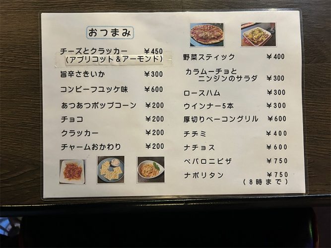 お酒に合う1品料理が揃い、ピザやナポリタン、中央亭のコロッケなども食べられます。