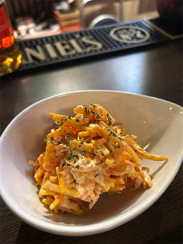 カラムーチョとニンジンのサラダは人気の1品。ニンジンの中にカラムーチョのパリパリ感が相まっておもしろい食感。じんわりくる辛さもお酒がすすみます。