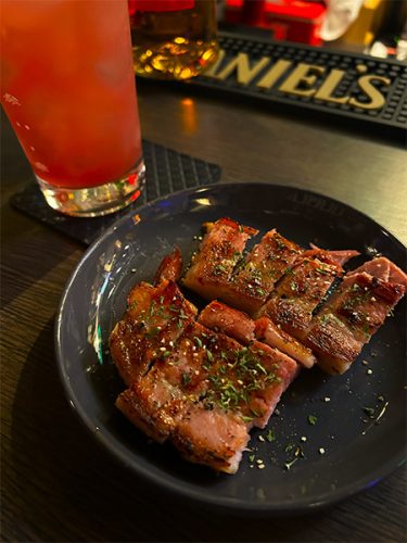 厚切りベーコングリルは、チリチリと焼く香ばしい匂いが食欲をそそります。