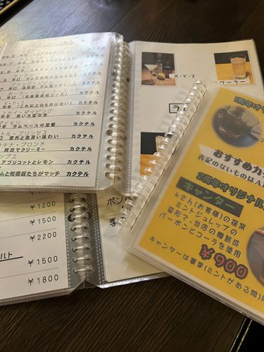 カクテルのリストがずらりと並び、メニューがファイルされています。