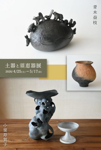 地元東濃で制作されている陶芸家 青木益枝さんと小栗寿賀子さんの二人展です。お二人の体を通じて土からうまれ出てきたカタチが、火焔に委ねられ、作品となります。野焼きや窖窯で焼かれた土器や須恵器。陶芸の原点を感じさせてくれるオブジェやうつわたちを、この機会に是非ご高覧ください。